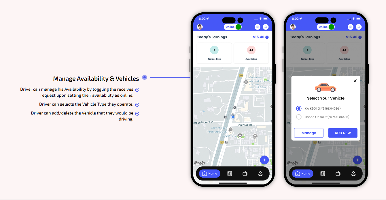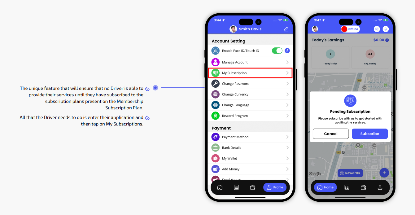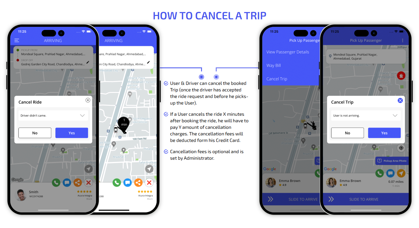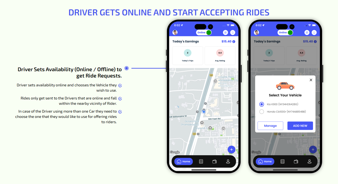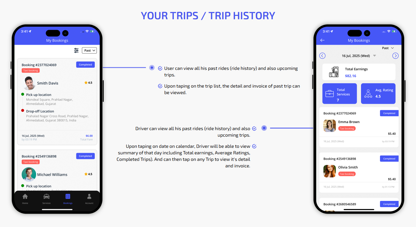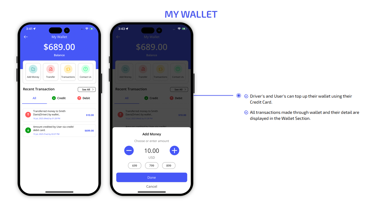 We provide different panels for users, drivers, and fleet organization. This user-friendly dashboard help manage their bookings, wallet, personal info, trip history and earnings and so forth. Look at the screenshots for more understanding.