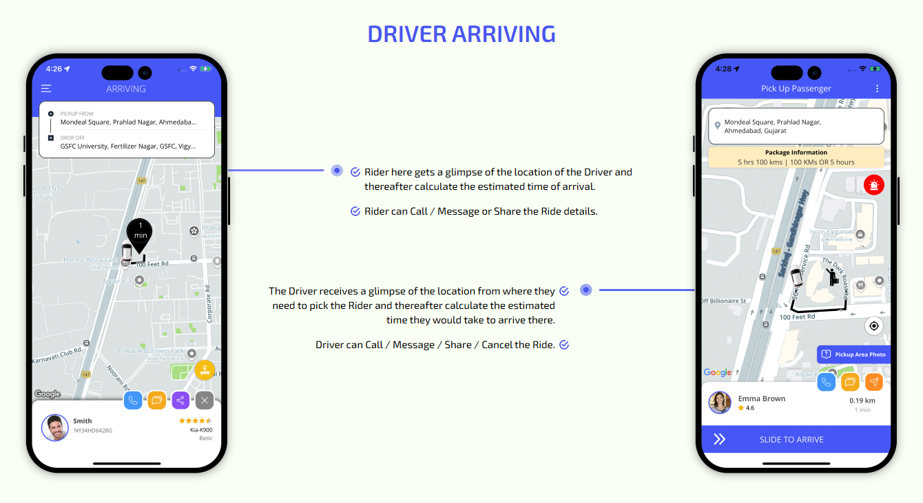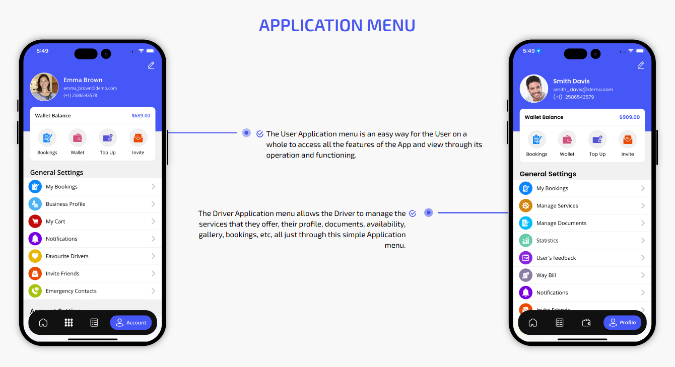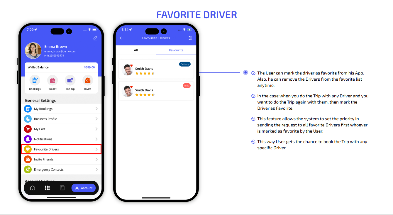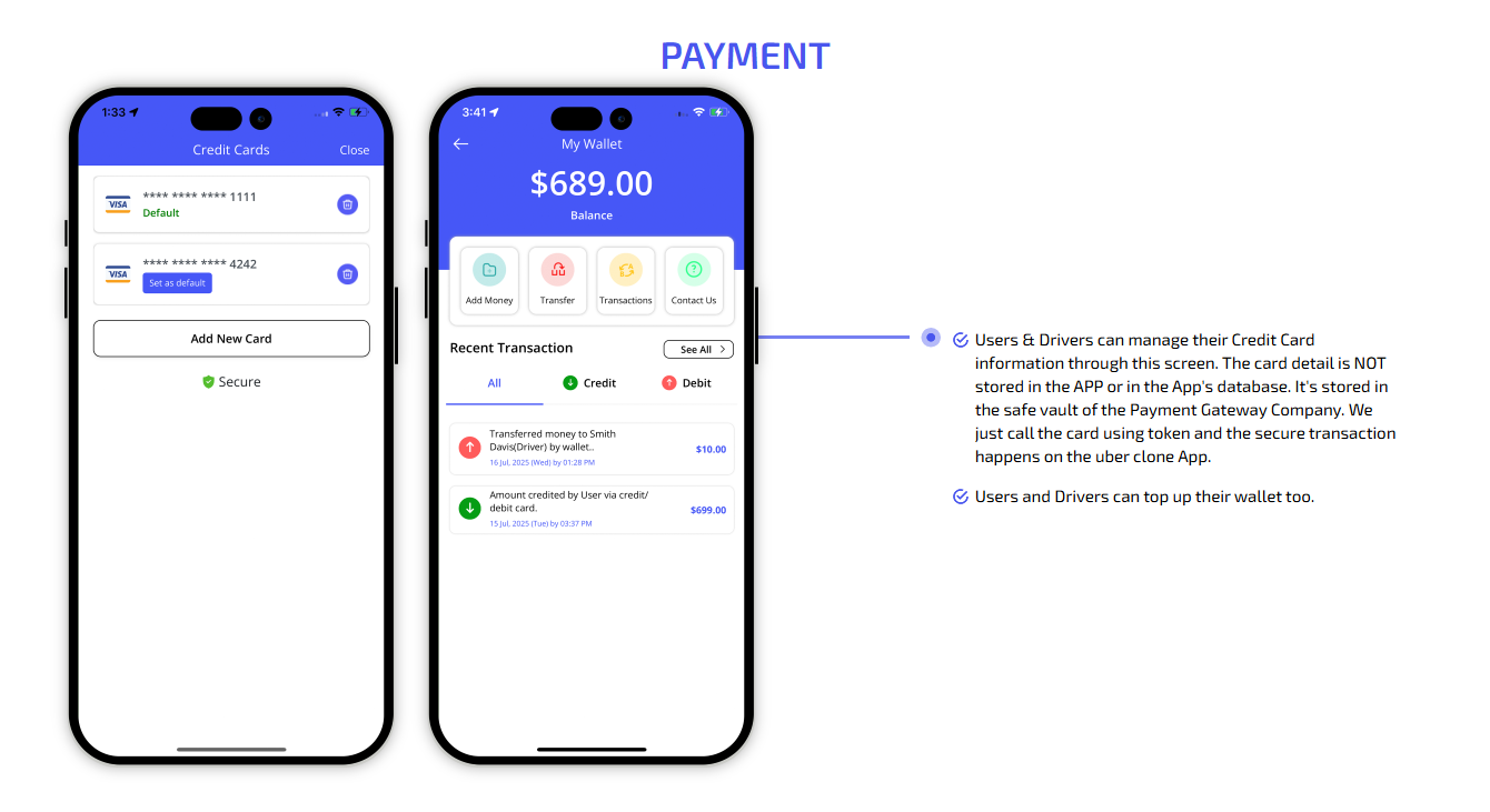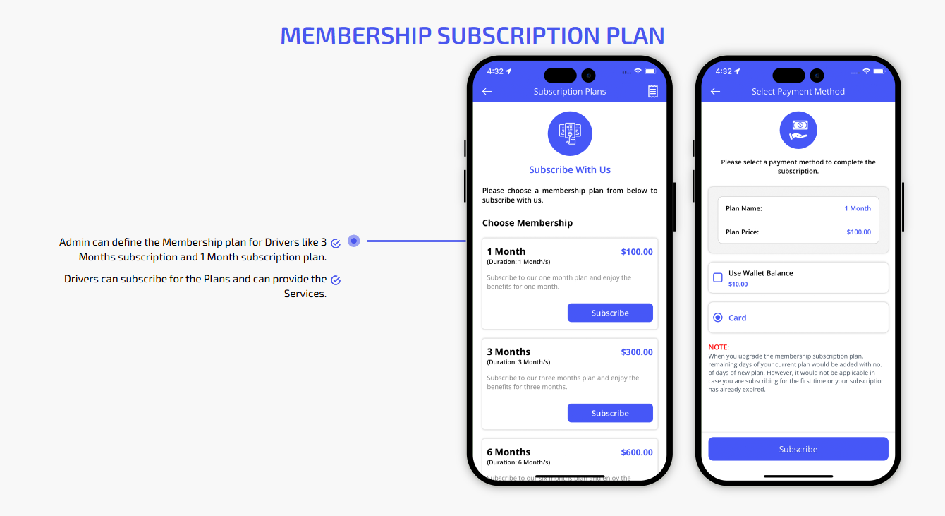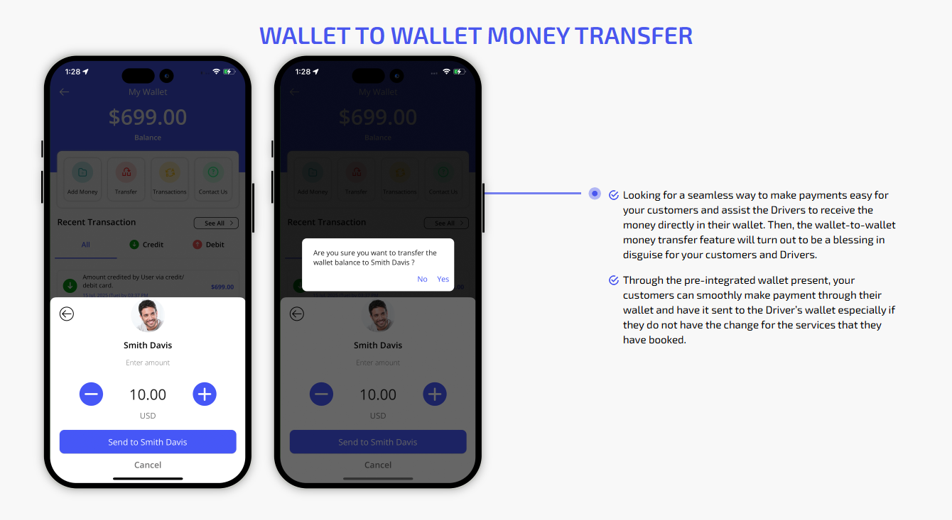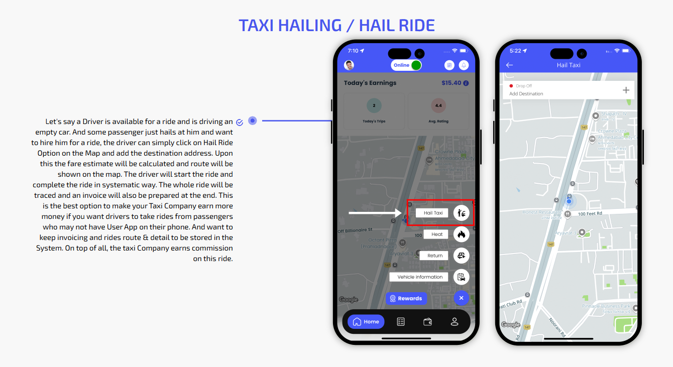 We provide different panels for users, drivers, and fleet organization. This user-friendly dashboard help manage their bookings, wallet, personal info, trip history and earnings and so forth. Look at the screenshots for more understanding.