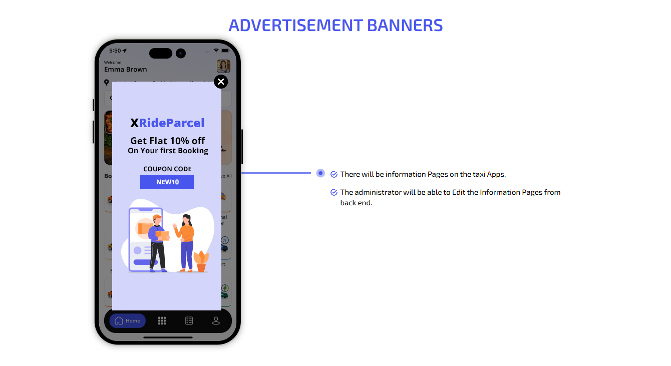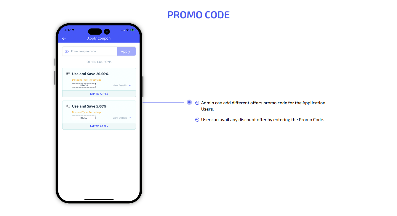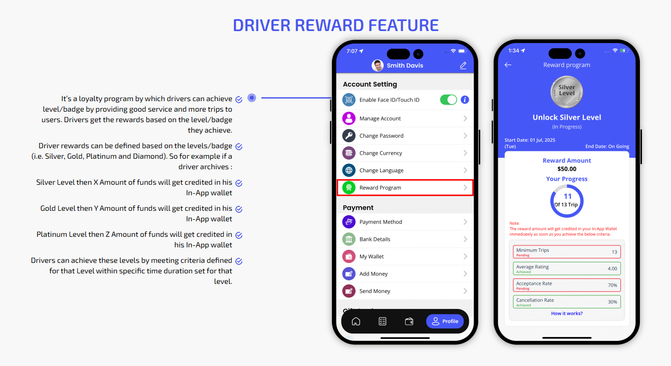 Our robust Admin Panel is designed to give you full control over your business from one centralized dashboard. Effortlessly manage users and drivers, set commission rates, create and monitor promo codes, handle customer reviews, and more. Every essential feature is integrated for you need to run and scale your App is seamlessly. It simplifies your daily management tasks.