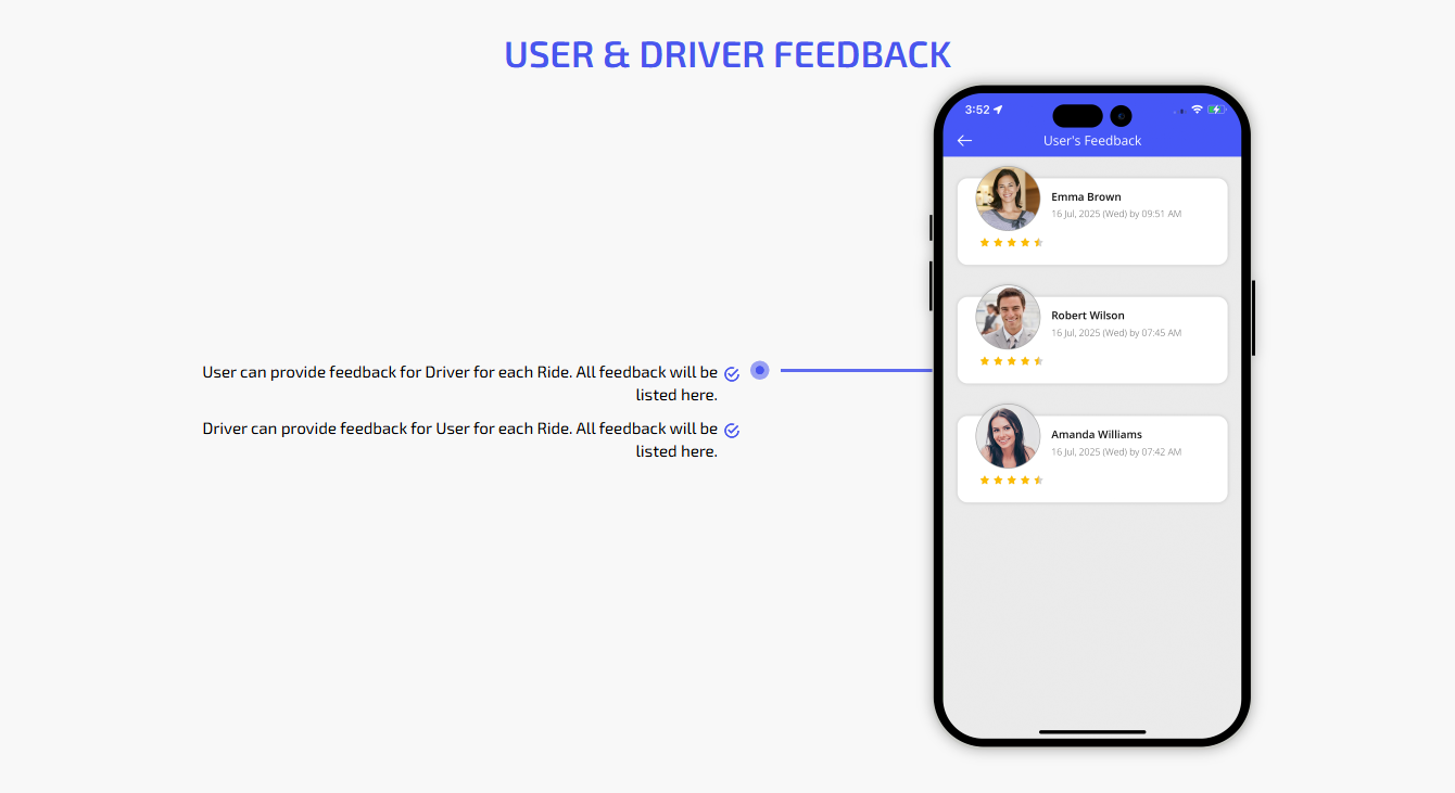 Forget manual calculations. Our advanced Billing Panel tracks all financial transactions automatically, user payments, driver earnings, and your commissions. You get real-time visibility and accurate reports, making your financial operations effortless and transparent.