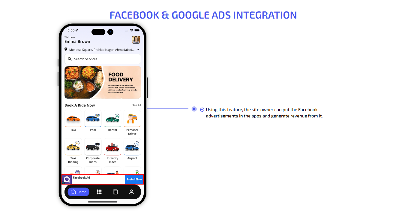 Your InDrive Clone comes with fully-fledged website which is more than a digital brochure. It acts as an active booking platform where book taxi rides, food deliveries, manage profile, view transactions, view earnings and more. It comes with customizable page setting, where you can update about us, contact us, FAQs and so on. Take a glimpse of the stellar website interface.